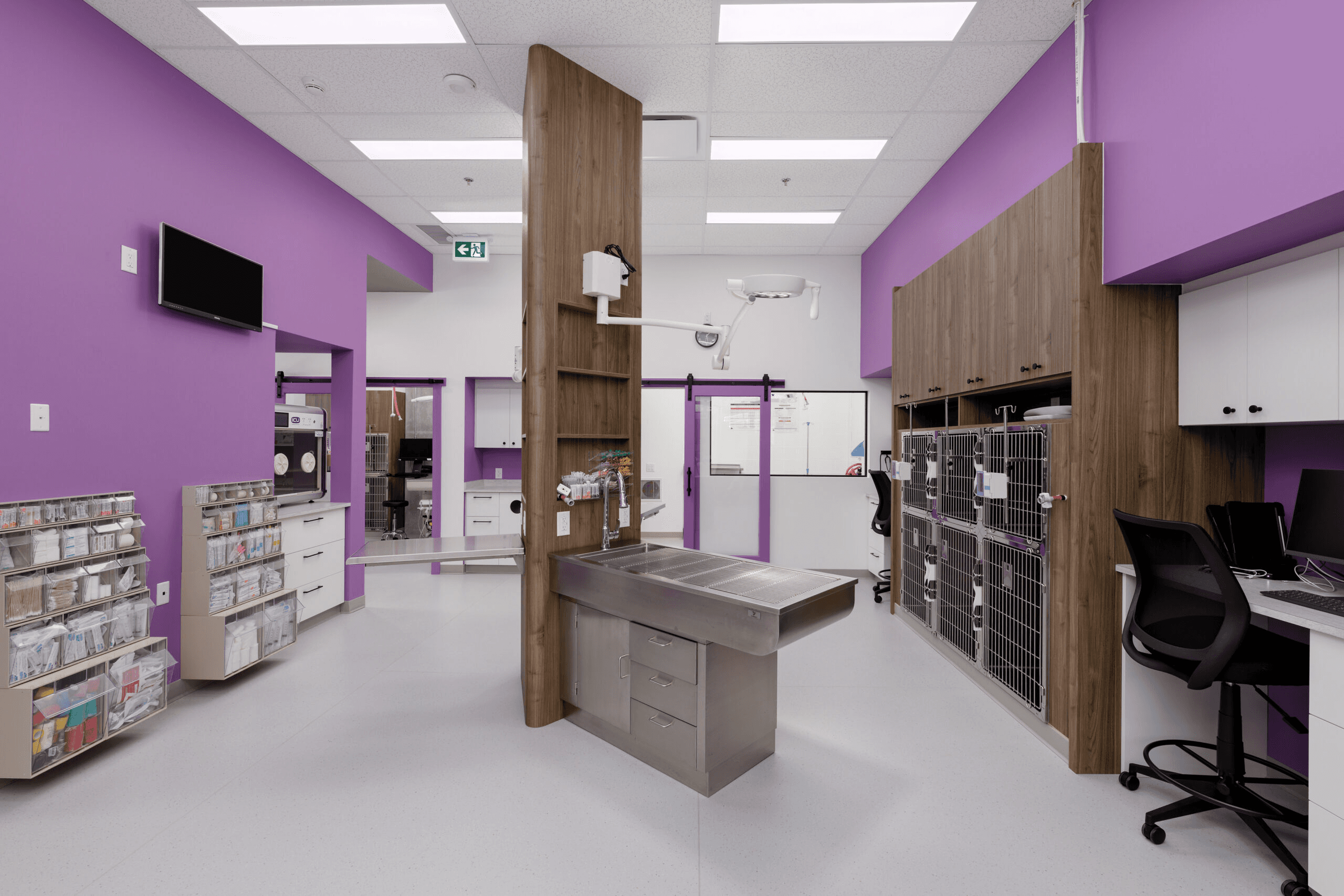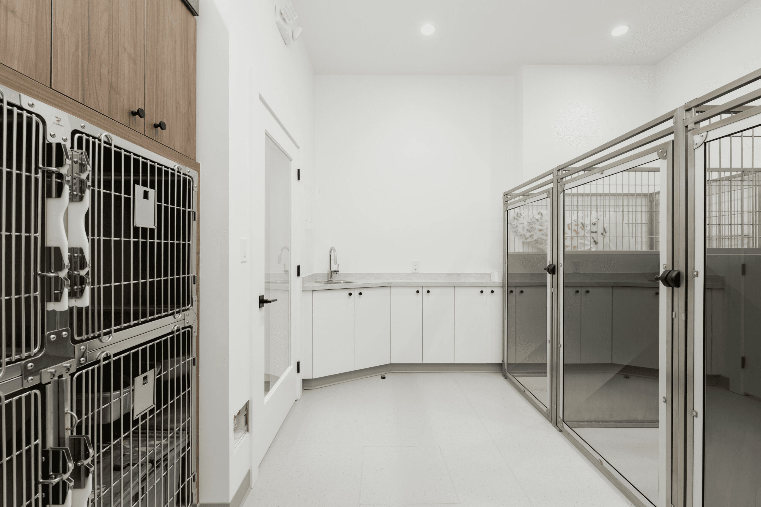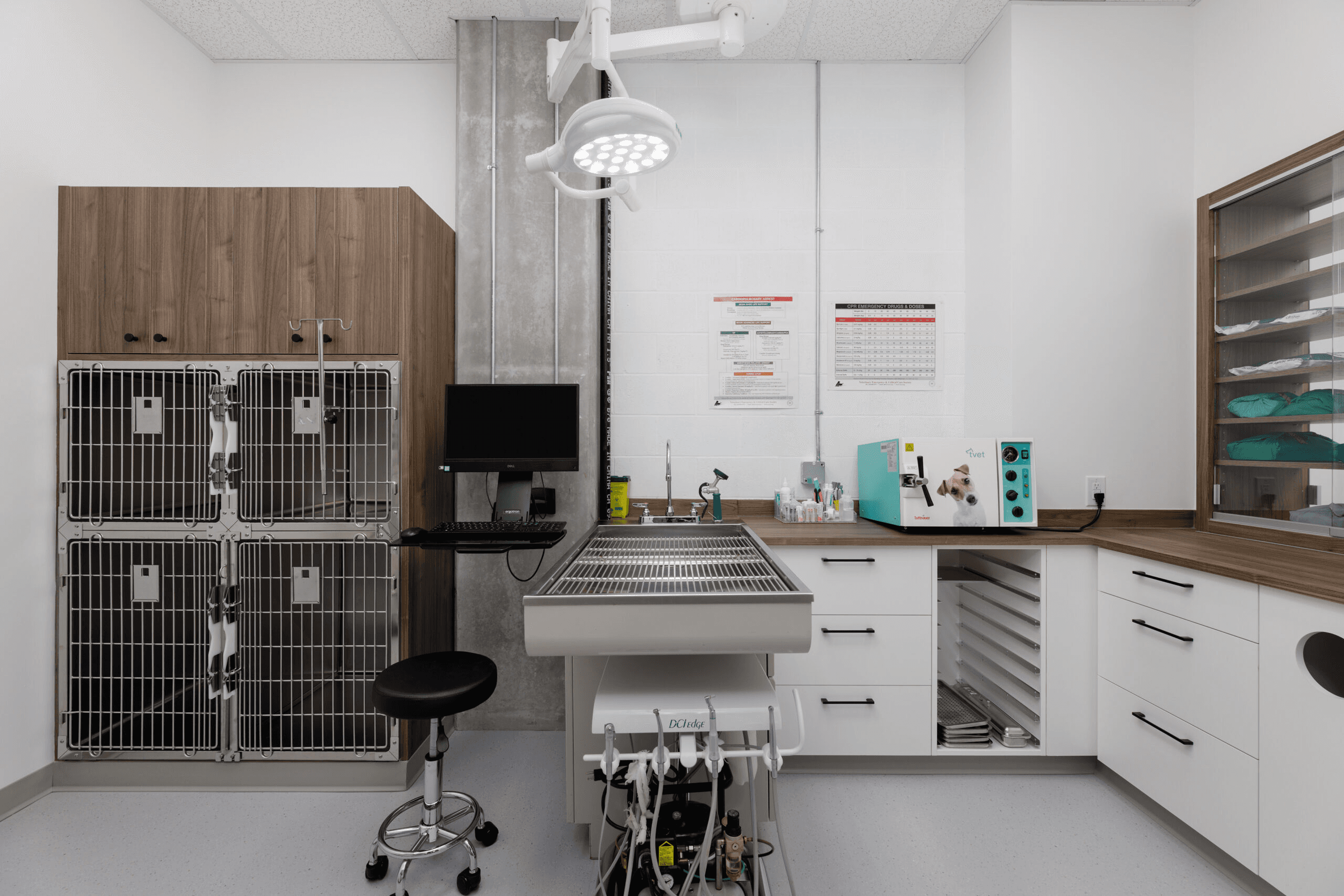 Where high-quality veterinary care, thoughtful design, and superior workmanship converge. Surgical suites, diagnostic imaging rooms, recovery areas, and client consultation spaces, all built to full-service hospital standards. Durable, easy-to-clean surfaces meet practical demands while warm design touches reassure every pet owner.
