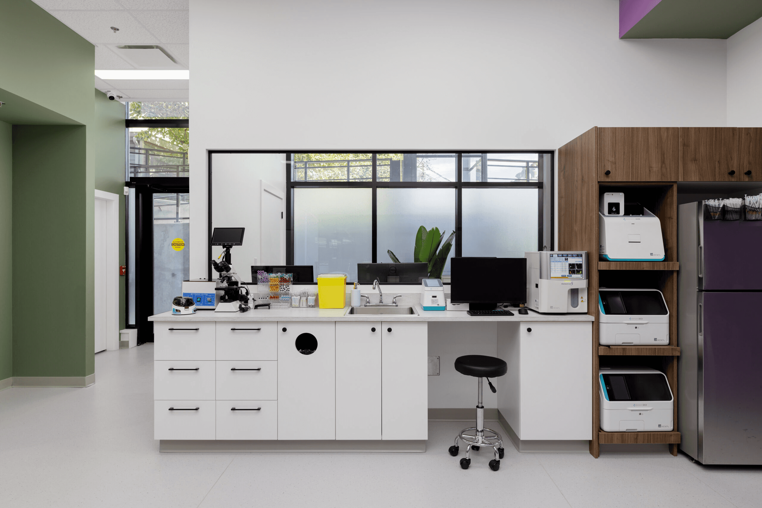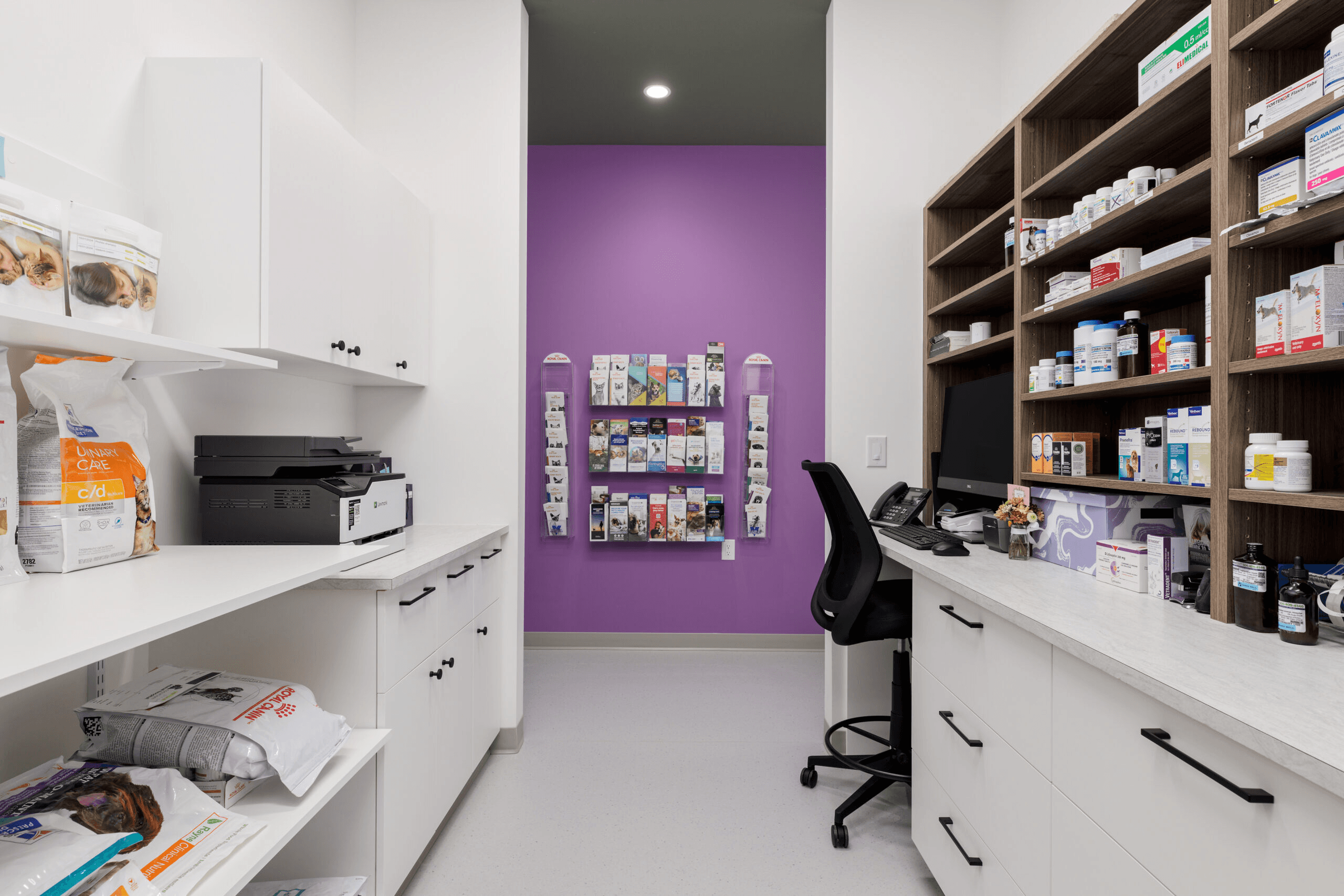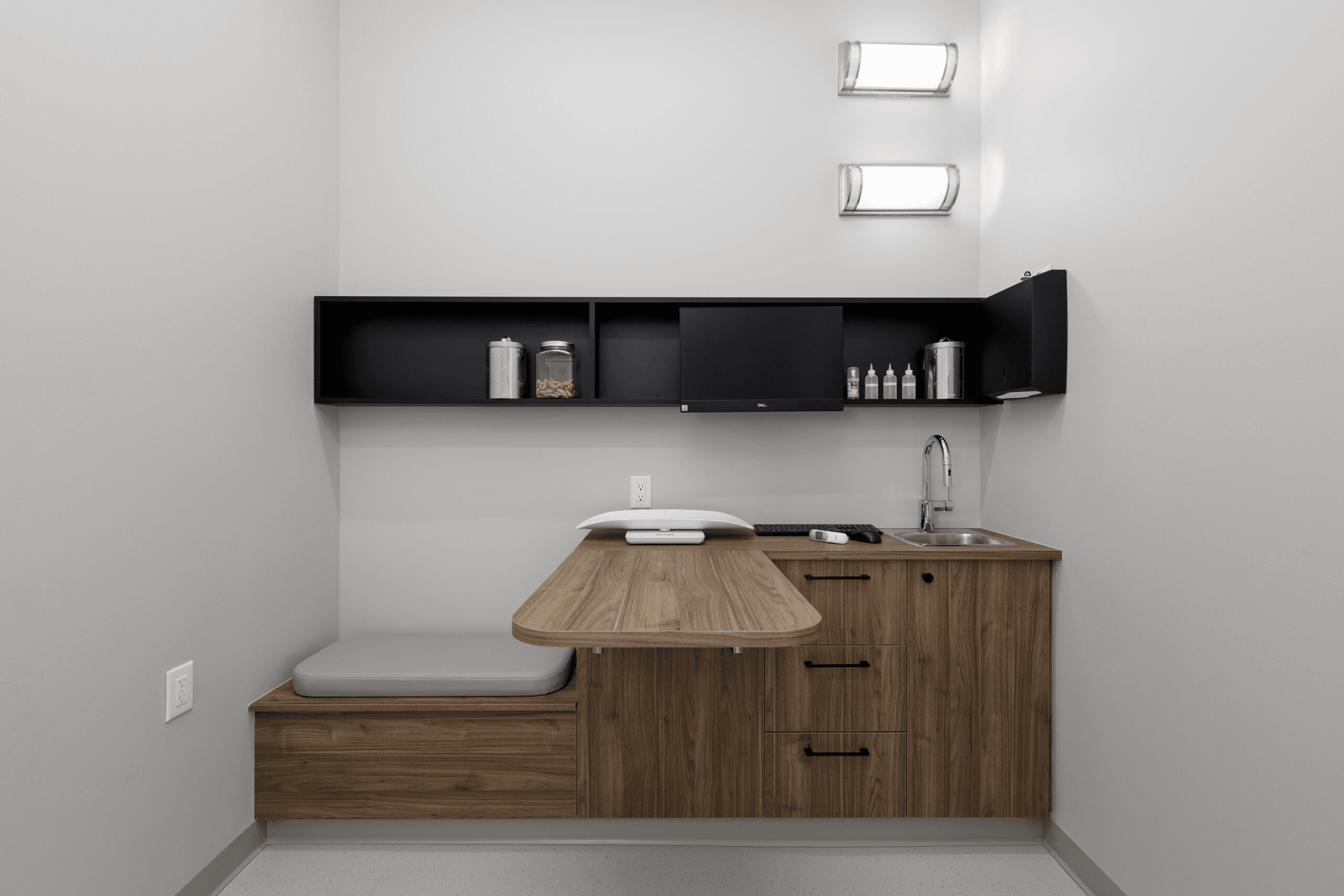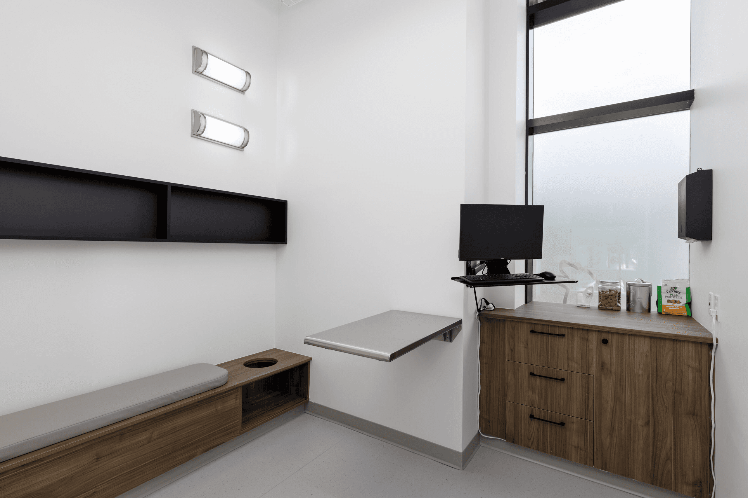 Where high-quality veterinary care, thoughtful design, and superior workmanship converge. Surgical suites, diagnostic imaging rooms, recovery areas, and client consultation spaces, all built to full-service hospital standards. Durable, easy-to-clean surfaces meet practical demands while warm design touches reassure every pet owner.