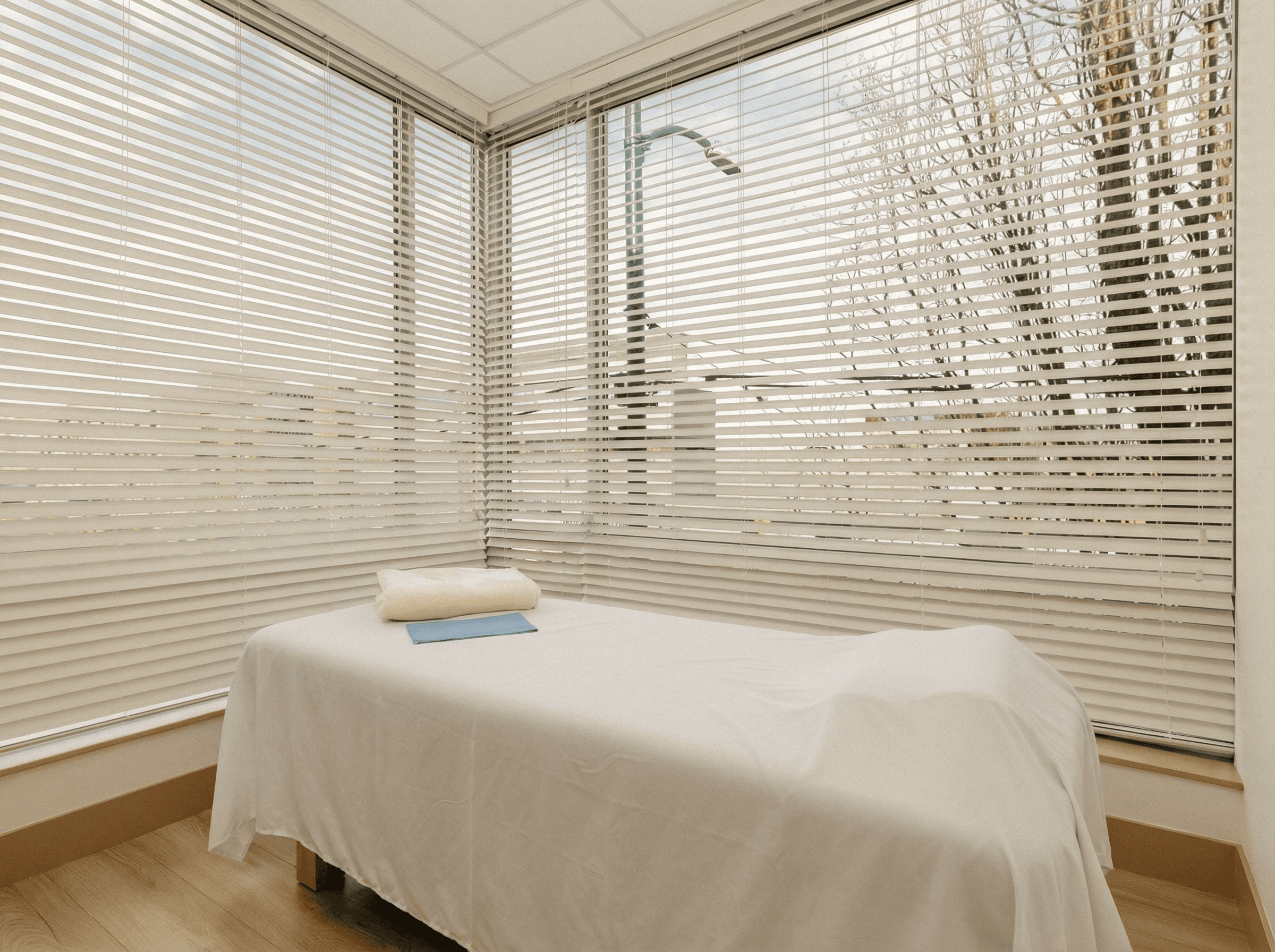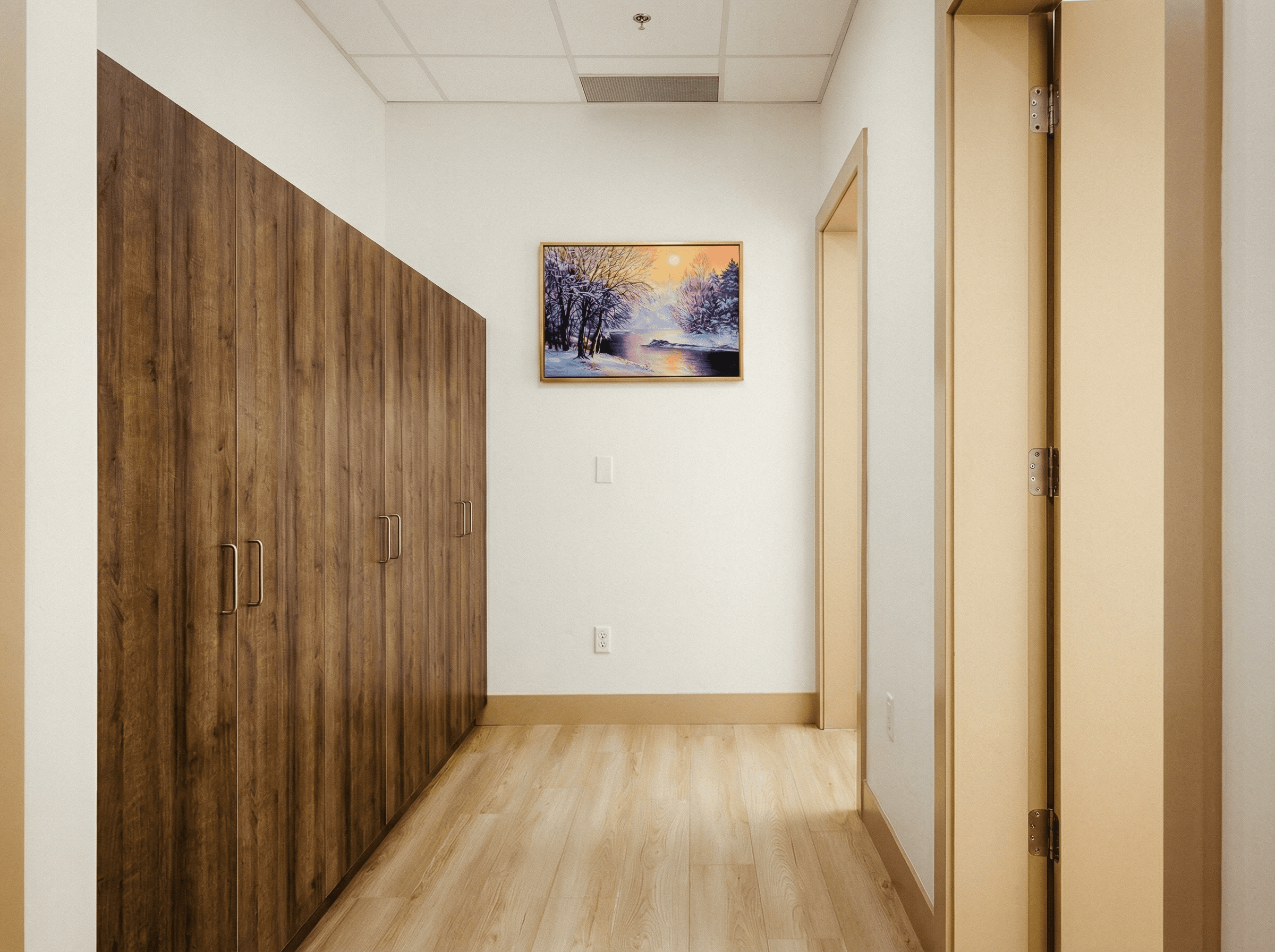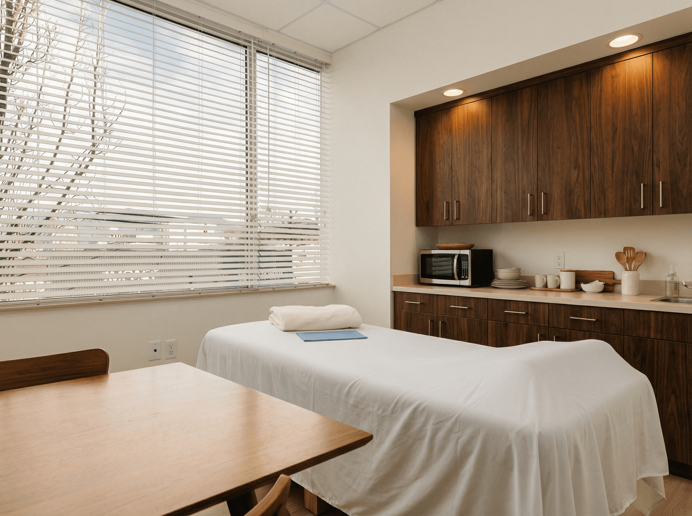 Private consultation rooms are bathed in natural light, with clean millwork and soft material palettes that support the restorative experience patients expect from a wellness-first environment.