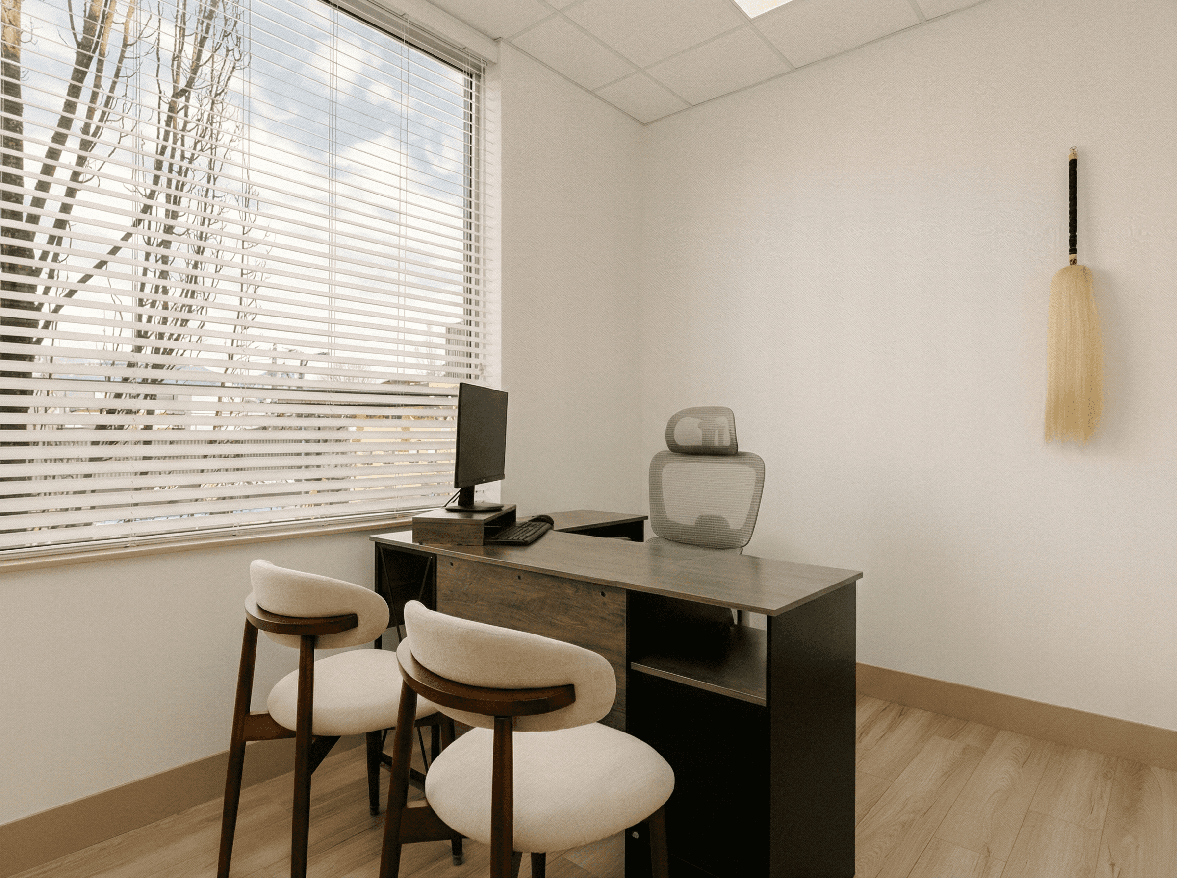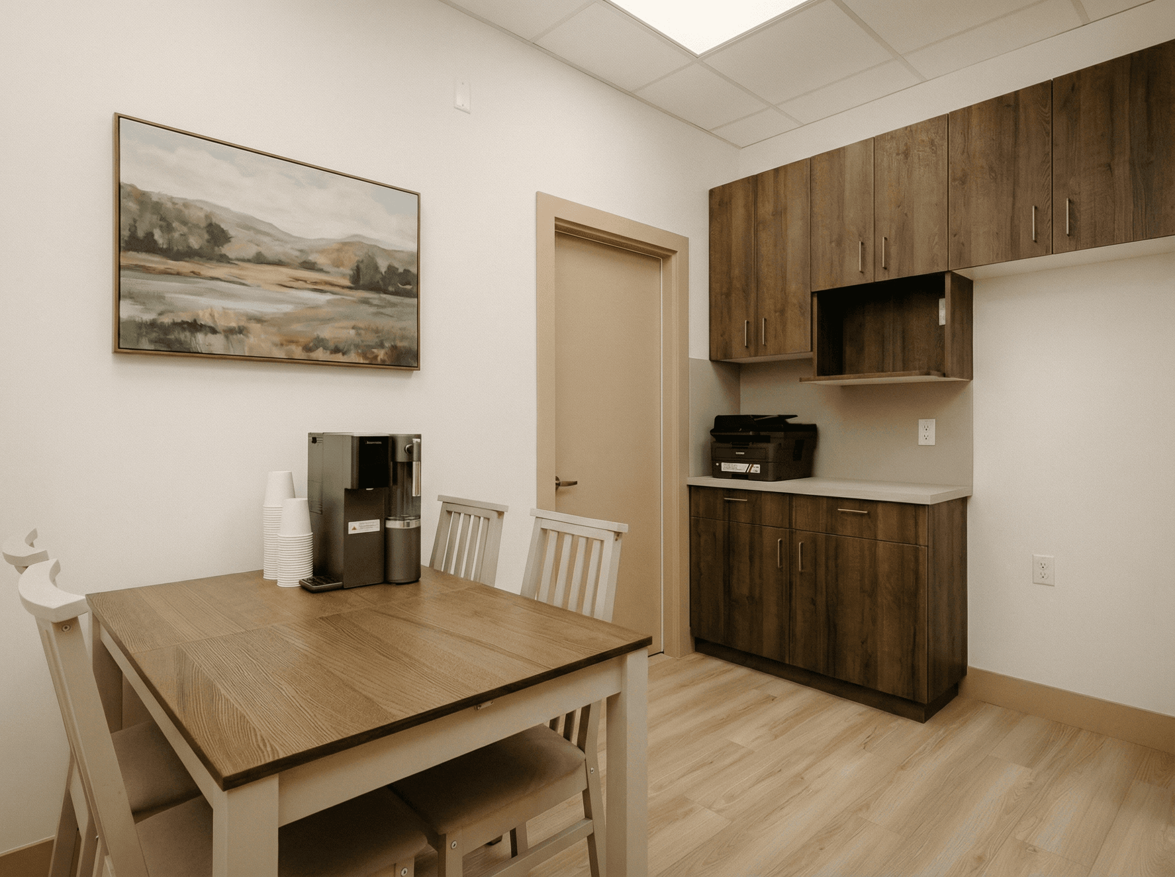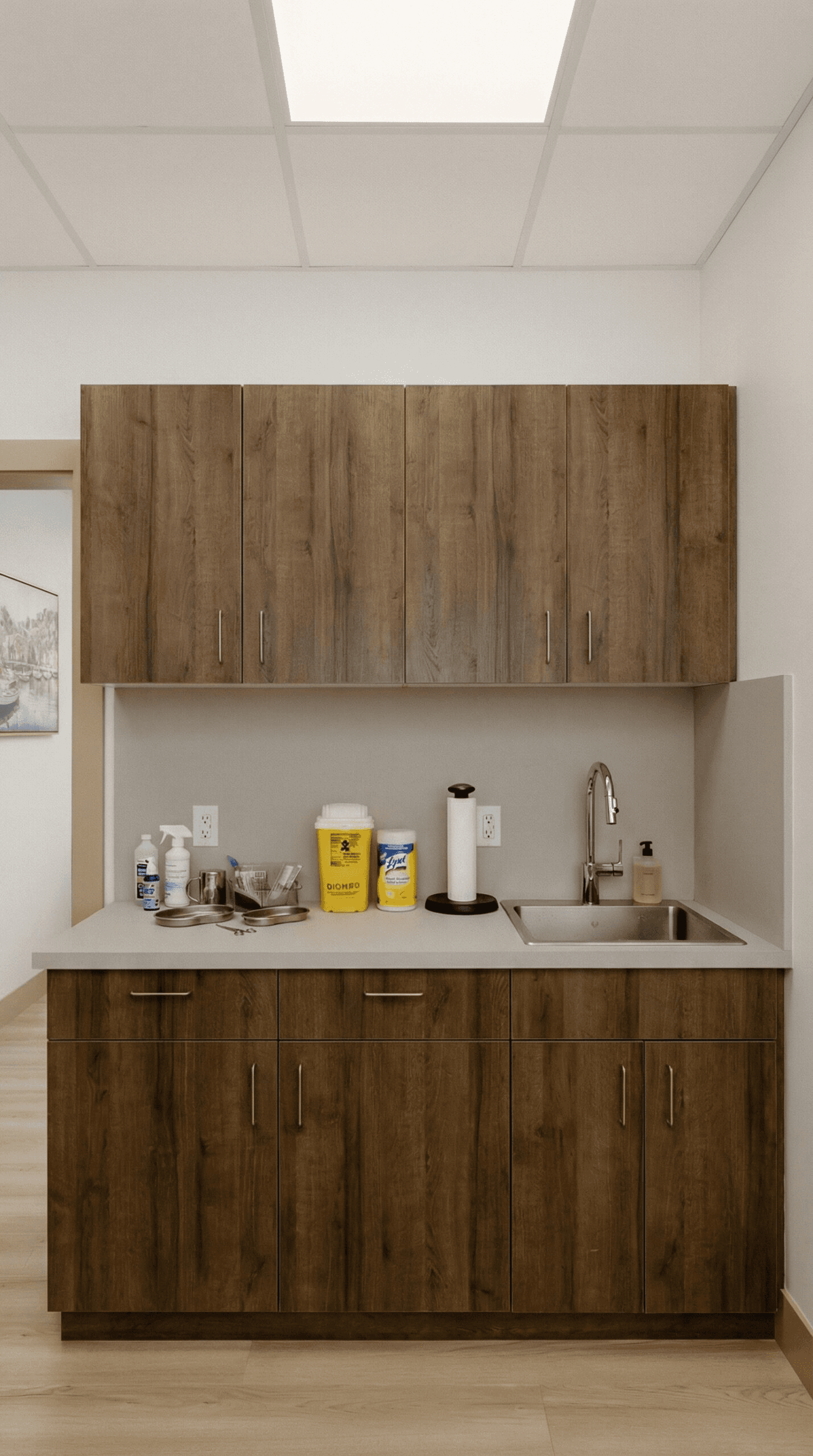 Private consultation rooms are bathed in natural light, with clean millwork and soft material palettes that support the restorative experience patients expect from a wellness-first environment.