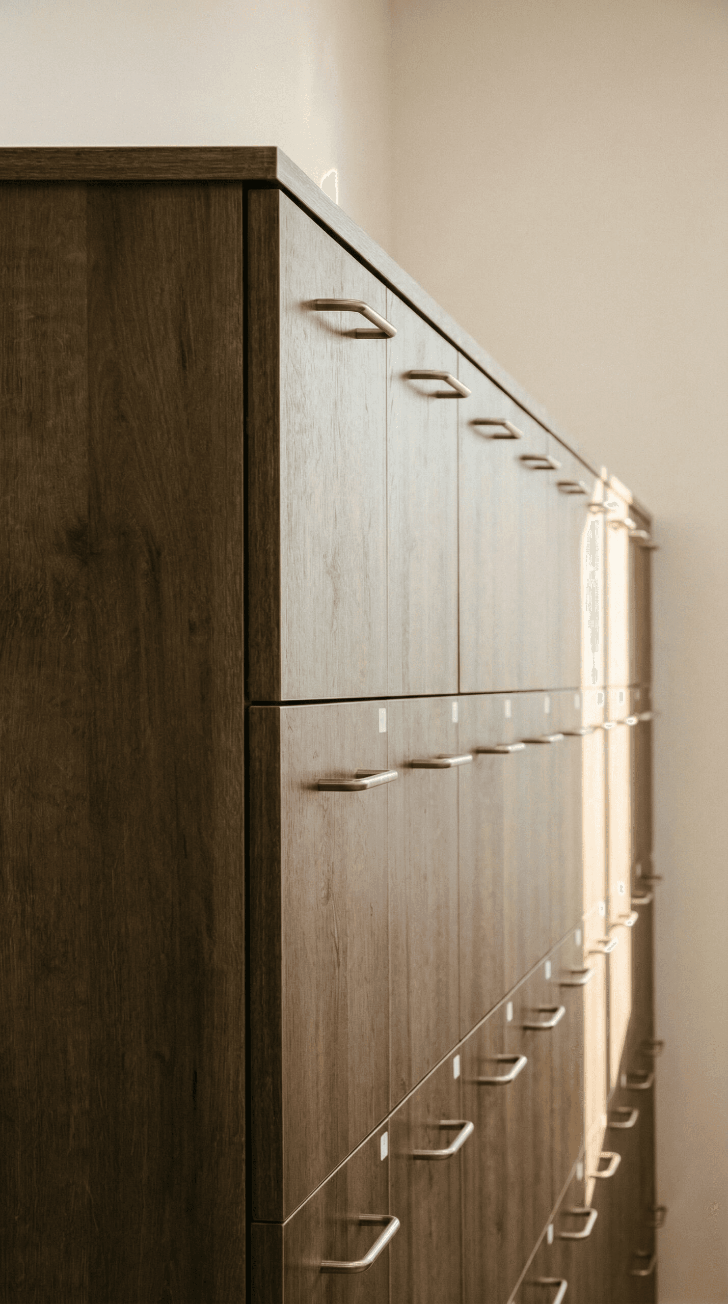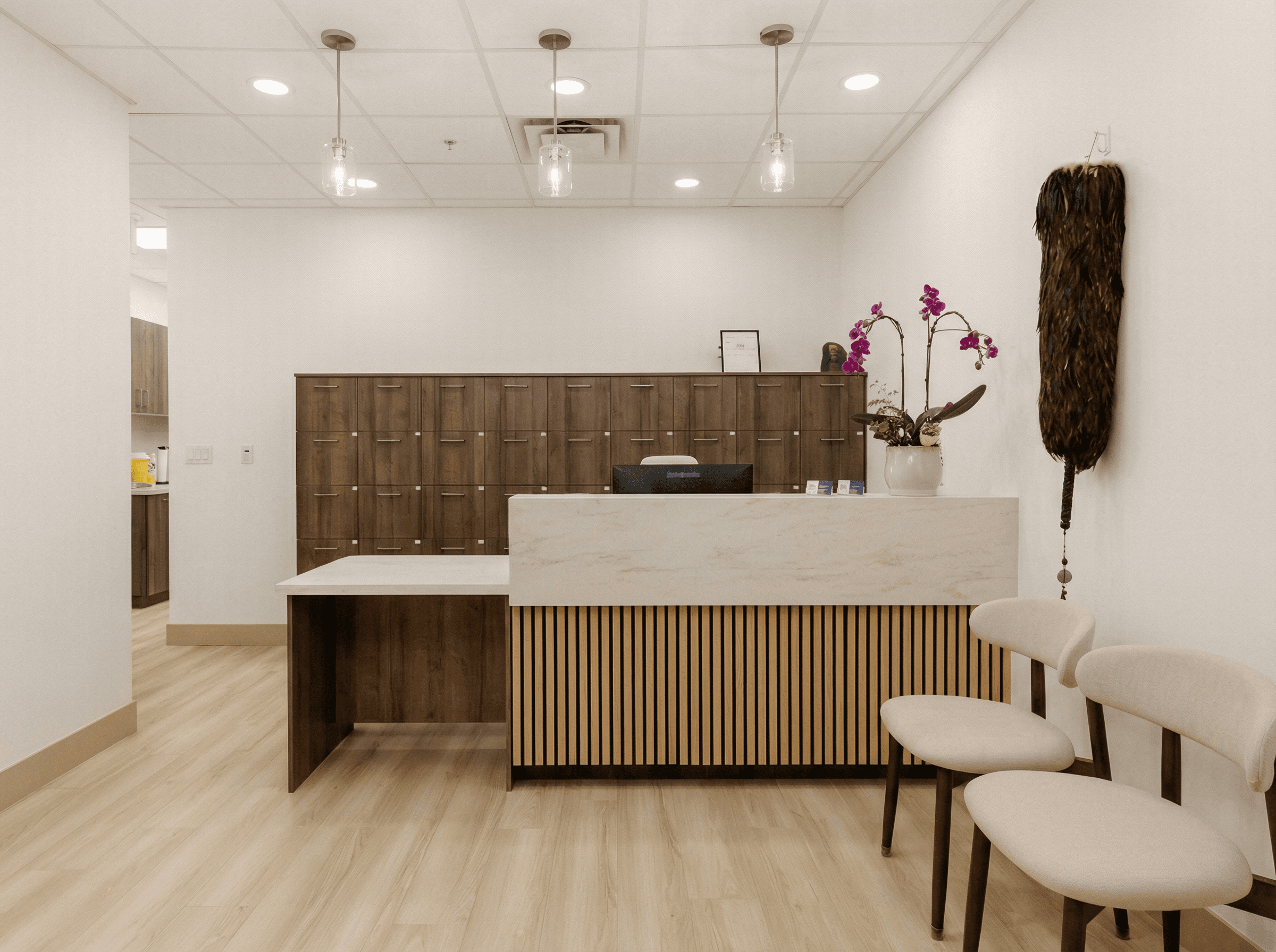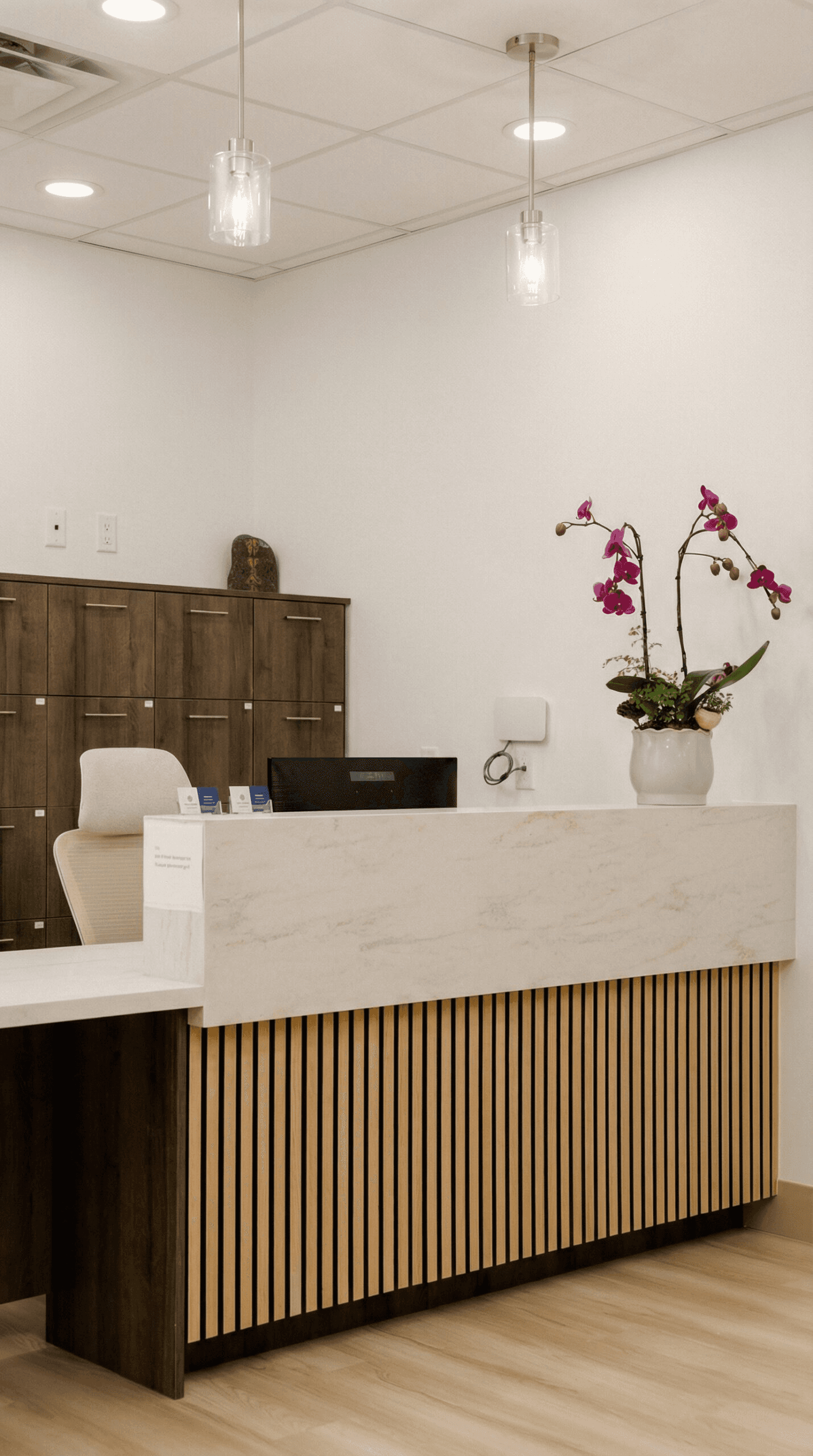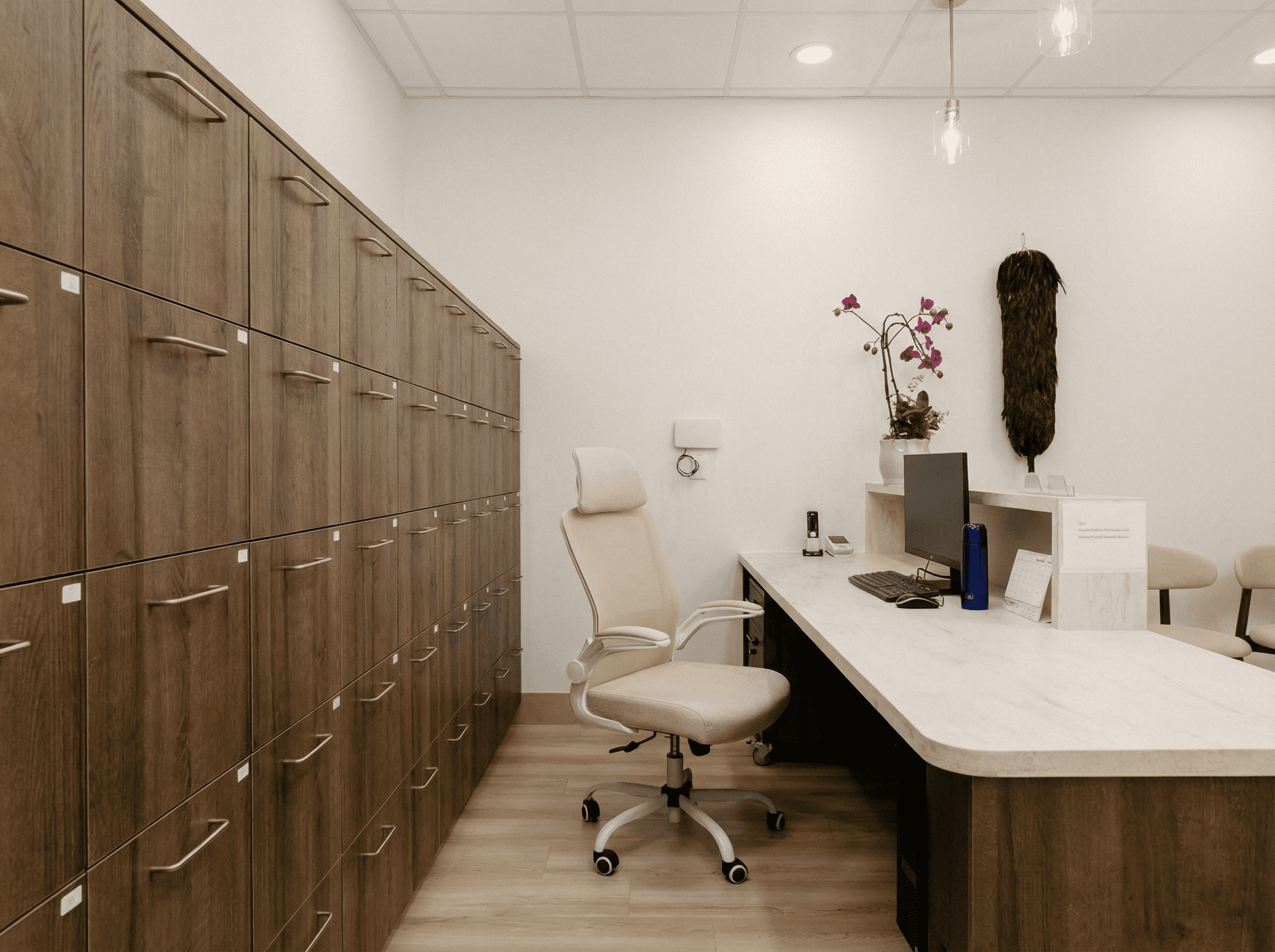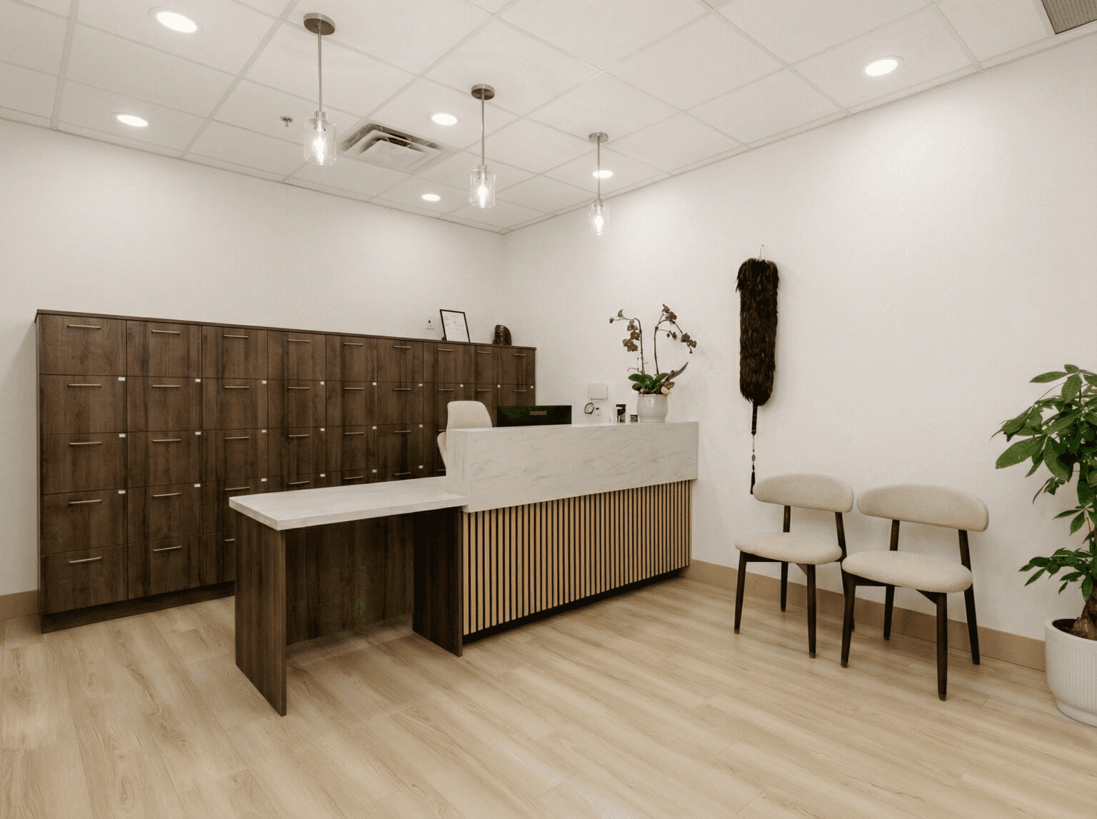 A sanctuary rooted in cultural heritage and modern wellness design. Shangyee Wellness blends Eastern healing traditions with contemporary West Coast aesthetics – from the marble-topped reception desk framed by vertical slatted wood paneling to the dark walnut locker cabinetry that anchors the client prep area.